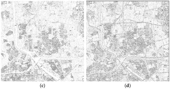 The first image pair consists of one SL image and one FSMI image describing the Forbidden City of Beijing, China. The resolutions of the two images are 1 and 5 m/pixel. We set the FSMI image as the reference image, which is shown in Figure 5a, and the SL image as the sensed image, which is shown in Figure 5b. The two images were imaged at different times and in different directions. The scale difference between them is five times, and we can observe that there exist a rotation difference (about 30°) and a translation difference. Since the two images have a large scale difference, we resize the two images to make a straightforward illustration, while the experiment still uses two images with different resolutions.