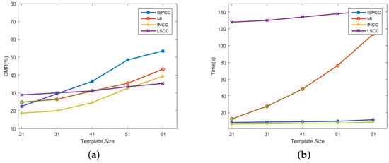 Figure 13. Comparisons of NCC, MI, LSCC and ISPCC on the second image pair. (a) Correctly Matching Rate (CMR) versus template size; (b) running time versus template size.