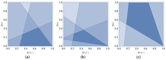Based on the four inequations above, we obtained the numerical results as shown in Figure 2a, the feasible region for the equalizer strategy adopted by the participant with the zero-determinant strategy is the intersection of these half-planes, which is a convex hull with four extreme points: , , , .
