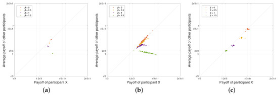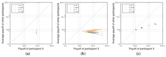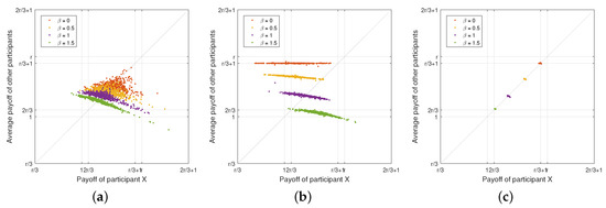 Extortion Strategy versus WSLS Strategy: Figure 6a illustrates the payoff of the participant who plays the extortion strategy while the other two opponents play the Win-Stay-Lose-Shift (WSLS) strategy. As we can see from the figure, all the points are located under the diagonal line, which means that the extortion strategy outperforms the WSLS strategy. The participant who plays an extortion strategy can always extort his/her opponents to achieve the fixed payoff no matter what his/her opponents’ choices are in each round. With the increase of the penalty factor , only the payoff of the WSLS strategy decreases while the payoff of the extortion strategy remains stable. Nonetheless, compared with the experimental results in Section 6, the total payoff of all participants reduces due to the competition among them, as expected.