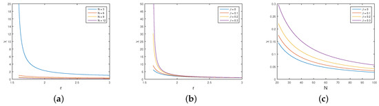 The upper bound of of the extortion strategy. (a) upper bound of vs. r (); (b) upper bound of vs. r (); (c) upper bound of vs. N ().