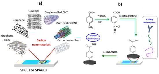 Functionalization of different carbon nanomaterial-modified SPEs (a) via diazonium salt reduction and affinity biosensor fabrication (b). Reprinted and adapted from [33] with permission.