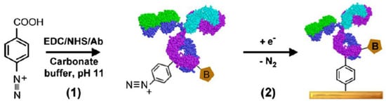 Strategies involving conjugation of capture antibodies with 4-carboxy methylaniline followed by diazotization to the respective diazonium salt modified antibody [23,24] (Figure 2), or with 4-carboxyphenyldiazonium salt to avoid the diazotization step in the presence of the protein, have been reported. Due to the high number of primary amines on the exterior, the proteins are indeed modified with several diazonium species.