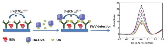 A label-free voltammetric immunosensor for the detection of β-lactoglobulin was developed by electrochemical modification of GSPEs with 4-nitrophenyldiazonium cations. The diazonium cations were prepared by the diazotization of 4-nitroaniline. Subsequently, the in situ generated diazonium cations were covalently grafted through an electrochemical reduction step on the graphene electrode surface, followed by the electrochemical reduction of the terminal nitro to amine groups used, upon their activation with glutaraldehyde for covalent immobilization of β-lactoglobulin antibodies [20]. By monitoring the decrease in the DPV reduction peak current of [Fe(CN)6]3−/4− in the presence of β-lactoglobulin, the immunosensor enabled a dynamic range from 1 pg mL−1 to 100 ng mL−1 and a LOD of 0.85 pg mL−1. Moreover, the immunosensor was applied to the analysis of different samples (cake, cheese snacks and sweet biscuits). Same authors proposed the use of the same GSPEs modified by cyclic voltammetry reduction of in situ generated 4-carboxyphenyldiazonium salt to develop voltammetric immunosensors for the sensitive detection of okadaic acid (OA) [59] and ovalbumin (OVA) [60]. The antibody was covalently immobilized onto the electrografted GSPE via carbodiimide chemistry. The immunosensor for OA determination was based on a competitive assay between OA and a fixed concentration of OA–ovalbumin conjugate (OA–OVA) for the immobilized antibodies and on measuring the [Fe(CN)6]3−/4− reduction peak current obtained by SWV (Figure 3). The higher the concentration of OA, the larger the SWV signal due to the lower amount of immobilized OA-OVA. The method allowed reaching a LOD of 19 ng L−1, a linear determination range up to ~5000 ng L−1 and successful applicability for the analysis of spiked shellfish tissue extracts and certified reference mussel samples. The method developed for OVA, based on the decrease in the reduction peak of [Fe(CN)6]3−/4− measured by DPV in the presence of the antigen, demonstrated to be appropriate for OVA determination in the concentration range from 1 pg mL−1 to 0.5 μg mL−1 with a LOD of 0.83 pg mL−1 and for the analysis of spiked cake extracts.