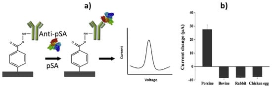 A label-free electrochemical immunosensor for the detection of porcine serum albumin (pSA) using CNF SPEs with a 4-carboxyphenyl layer electrografted using the 4-carboxyphenyl diazonium salt was proposed by Lim et al. (Figure 4) [61]. Antibodies were covalently immobilized onto the modified electrodes previously activated with EDC/NHS and the increase in the SWV cathodic peak current of anionic redox probe recorded after immunocomplex formation with antibodies, attributed to the strong affinities of serum albumins like pSA towards anions, was used for the detection. This immunosensor exhibited a wide linear range (0.5–500 pg mL−1) and a low LOD (0.5 pg mL−1) in buffer solution. Moreover, the feasibility of this approach for practical application was demonstrated by satisfactory recoveries in spiked undiluted fresh raw pork samples.