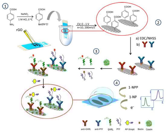 Another configuration of a disposable immunosensing platform for the simultaneous determination of two obesity-related hormones, ghrelin (GHRL) and peptide YY (PYY) was also reported by this group [62,63]. SPdCEs were modified with reduced graphene oxide (rGO) and, after grafting of the diazonium salt of 4-ABA on these modified electrode surfaces, the corresponding capture antibody for each target hormone was covalently immobilized onto the 4-carboxyphenyl moieties of each working electrode via EDC/NHS chemistry (Figure 5). The determination of each hormone was performed by direct competitive immunoassays with the corresponding biotinylated hormones for the immobilized capture antibody. After labeling the attached biotinylated hormones with a polymer of streptavidin-phosphatase (AP-Strep), the DPV signal obtained in the presence of 1-NP was used to monitor the affinity reactions. This dual immunosensing scaffold provided linear current vs. log [hormone] plots extending between 10−3 and 100 ng mL−1 and 10−4 and 10 ng mL−1 for GHRL and PYY, respectively. The usefulness of this approach was also demonstrated by its application for the accurate determination of the analytes in spiked human serum and saliva samples.
