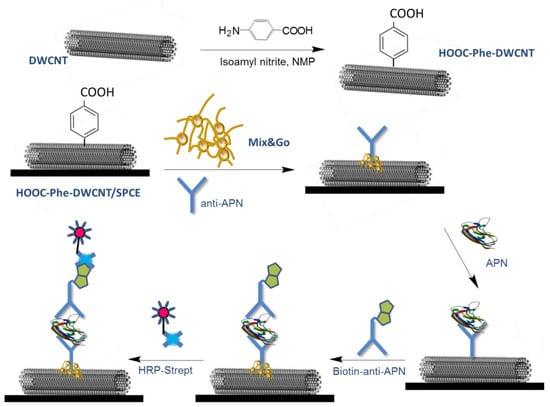 SPCEs modified with double-walled carbon nanotubes (DWCNTs) previously functionalized with an aryl diazonium salt by the Bahr and Tour’ method [96] were used for developing an electrochemical immunosensor for adiponectin (APN). DWCNTs were treated with p-ABA in the presence of isoamyl nitrite in N-methyl-2-pyrrolidone (NMP) resulting in the formation of 4-carboxyphenyl-DWCNTs without any electrochemical treatment. The oriented binding of specific antibodies toward APN was accomplished by using the metallic-complex chelating polymer Mix&GoTM (Figure 6). A calibration plot for APN was constructed with a range of linearity extending between 0.05 and 10.0 μg mL−1, and a detection limit of 14.5 ng mL−1. The usefulness of the immunosensor for the analysis of real samples was demonstrated by analyzing human serum from female or male healthy individuals [86].