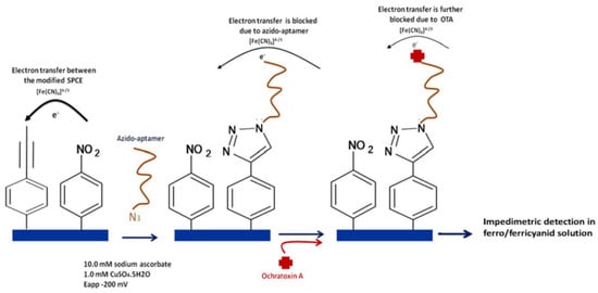 Hayat et al. [21] developed a highly sensitive and reusable aptasensor for the impedimetric detection of ochratoxin A (OTA) by covalent immobilization of a specific aptamer onto SPCEs modified with two binary films of diazonium salts via click chemistry. SPCEs were modified sequentially by electrografting of protected layers of 4-((trimethylsilyl)ethynyl) benzene (TMSi-Eth-Ar) and p-nitrobenzene (p-NO2-Ar) by means of electrochemical reduction of their corresponding diazonium salts. After deprotection, by treatment with tetrabutylammonium fluoride (TBAF), and in the presence of copper (I) catalyst, the active ethynyl groups of the film and the azide moiety of the aptamer reacted efficiently forming a covalent 1,2,3-triazole linkage (Figure 7). The increase in the electron-transfer resistance (RCT) values measured by EIS in the presence of [Fe(CN)6]4−/3− was proportional to the OTA concentration between 1.25 and 500 ng L−1 with a LOD of 0.25 ng L−1. The aptasensor could be regenerated 10 times with a mild solution, showed a storage stability of at least 10 days at 4 °C, and was successfully applied to the analysis of spiked beer samples.