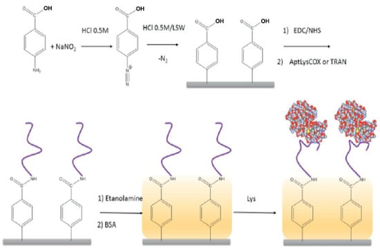 More conventional strategies involve antibody immobilization onto electrodes previously modified with the diazonium salt. These strategies include: (i) modification of SPCEs [5,58,68,69,70,85], carbon nanomaterial-modified SPEs [33], graphene-modified SPEs (GSPEs) [59,60], carbon nanofiber-modified SPCEs (CNF SPCEs) [61] and reduced graphene oxide (rGO)-SPCEs [62,63] with 4-carboxyphenyl diazonium salt; (ii) modification of GSPEs with p-nitroaniline diazonium salt [20]; (iii) modification of graphite-based SPEs with p-aminophenyl acetic acid [58]; (iv) modification of glassy carbon electrodes (GCEs) with a mixed layer of oligo(ethylene glycol) species (OEG) and oligo(phenylethynylene) molecular wires (MW) [44].