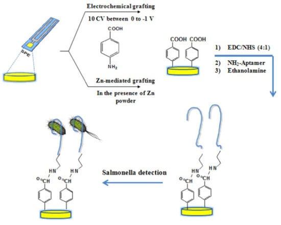 Apart from antibodies and nucleic acids, aryl diazonium salt derived layers have also been used for cells immobilization [74,114]. For this purpose, a novel phenyl boronic acid pinacol ester diazonium salt was synthesized so that, after assembly onto the electrode surface, addition of sodium iodate removed the pinacol protecting group to yield a phenylboronic acid functionalized surface. By exploiting the selective reaction of boronic acid with sugars, these scaffolds were used to immobilize yeast cells [74] and murine macrophages (mammalian cells belonging to the immune system) [114]. Claimed advantages of these bioscaffolds include the possibility to release the captured cells from the surface by exposure to fructose due to the competitive reaction of this sugar with the cells for the boronic acid of the functionalized surface. Furthermore, a label free impedimetric aptamer sensor for Salmonella typhimurium (S. typhimurium) detection was reported by Bagheryan et al. [95]. A diazonium-supporting layer was fabricated onto a SPCE followed by immobilization of aminated aptamer (Figure 9). The developed design responded linearly over the 10–108 CFU mL−1 range with a limit of detection of 6 CFU mL−1. Good recoveries were obtained in the application to spiked apple juice.