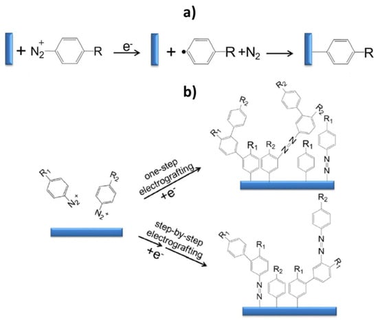 Reaction mechanisms proposed for the preparation of single (a) or multiple (b) layers onto electrode surfaces through electroreductive electrografting of aryldiazonium salts. In (b) R1 and R2 represent two different substituents. Reprinted from [30] with permission.