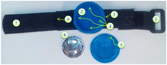 Proposed MetaWear casing, Velcro elastic belt, buckles and IMU sensor: (1) Buckle and Elastic Belt: the buckle is sewn onto an elastic belt for fastening to Velcro; (2) Bottom case which keeps the sensor safe from pressure, temperature and water; (3) Lock Open Edge which helps to open the cover from bottom case; (4) Sensor Lock Mechanism: The four locks keep the sensor sideways movement and orientation; (5) Cover Lock Mechanism which tightly locks with the case; (6) Velcro-Elastic Joint: The elastic belt is sewed with Velcro; (7) Velcro which adjusts and tighten when the sensor is attached; and (8) IMU sensor and battery.
