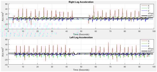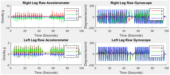 The red, green and blue lines in Figure 4 stand for accelerometer readings on x, y and z axis, respectively, with g units (9.81 m/s2) in the sensor frame. We can observe from the raw data that the accelerometer reading on x is the highest and z is the lowest before the commencement of walking for right leg indicative of the initial gravitational force. Similarly, the accelerometer reading on y is the highest and z is the lowest before the commencement of walking for left leg. The initial data is not aligned to zero means that the sensors are not placed perfectly upright position with the earth frame in the foot locations due to the initial gravity part of y and z. For this study, the sensors do not need to be perfectly upright which in any case is not user-friendly and impossible. The discrepancy between the sensor frame, the foot frame and the earth frame are compensated for in this study.