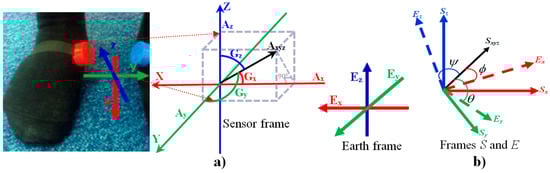 (a) Sensor frame and earth frame of accelerometer and gyroscope axes; (b) The orientation of frame E is achieved by a rotation, from alignment with frame S, of angle of φ, θ, and ψ around the axis Sxyz.