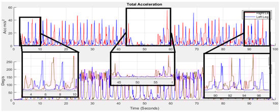 From Figure 10, we can observe that at the start and end of each stride, the walker’s feet are stationary on the ground. As the IMU sensor is attached to the foot, the stance phase is stationary and swing phase is non-stationary. Due to the walker’s movement towards the x axis, the acceleration shows its highest value in the swing phase. The output of the accelerometer signal will be different, if the sensor is placed on foot [,], waist [] or different body locations [,].