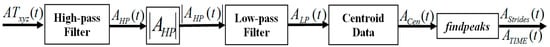 The accelerometer converts acceleration to an electrical signal and in the process, unwanted constant bias in acceleration becomes a linear error called drift. Thus the 2nd order Butterworth digital high-pass filter with a sampling rate fs = 50 Hz and cut off frequency fc = 1000 Hz is applied to ATxyz to remove the corrupted data and the DC component of the acceleration signal. The smoothness is achieved at the price of decreased roll off steepness. The output from the filter is then passed to the zero phase filtfilt delay filter. The filtfilt corrects for phase distortion introduced by a one-pass filter []. The output of filtfilt filter then is passed through a low-pass filter with fc = 5 Hz to obtain ALP which is shifted to centroid using Equation (3).