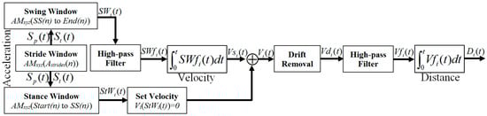 As the stationary period in stance phase velocity is set to zero, the integral constant from non-stationary period in swing phase exists in Vi(t). Therefore, it is important to remove the drift caused by integration from Vi(t). To remove the integral drift [], the velocity difference between the initial and end of a non-stationary period is estimated. The velocity difference is then divided by the number of samples during this non-stationary period to get the drift rate. The drift rate is multiplied with the corresponding data index to estimate the drift value at that certain point. The drift value is then subtracted from the calculated velocity Vi(t) to obtain the error free velocity Vdi(t). Vdi(t) is then passed through the high-pass filter for the 2nd time and the distance Di(t) is estimated after 2nd integral operation. Di(t) consists of the distance towards x, y and z coordinates. Repeat the same procedure for all strides to calculate velocity and distance. Then estimate the travelled distance using Equation (4):