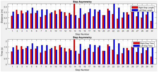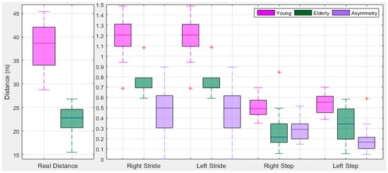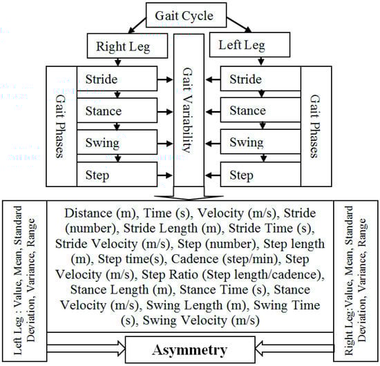Gait asymmetry (GA) is an indicator of different diseases and disease progression. It results in reduced gait efficiency and activity levels. Objective assessment of GA is important in the treatment and rehabilitation of patients with various conditions such as falls or after orthopaedic surgery. Gait is the result of a series of rhythmic alternating movement of arms, legs, and trunk which create forward movement of the body []. It relies on complex mechanisms depending upon the closely integrated actions of musculoskeletal, nervous system (central and peripheral), visual, vestibular, auditory systems; joint mobility and the smooth propulsive movement of the center of gravity. Every individual’s gait pattern should be symmetrical with right and left sides performing identical movements. This is not the case since every individual has a unique gait pattern and the limb movement of one side is not exactly repeated on the other side, which results in GA. GA analysis provides bilateral locomotive information of gait parameters (e.g., length and period of stride, step, stance and swing), kinematic and kinetic measurements (e.g., angular joint trajectories, angular joint velocities, joint forces, and reaction forces), muscular measurements (e.g., muscle contraction, muscle force) and energy expenditure (e.g., oxygen consumption, heart rate) []. This is employed in different domains such health, sports and rehabilitation. GA can be a determinant of recovery in patients with different diseases such as Parkinson’s disease [] and stroke []. It can be used to monitor and improve an athlete’s performance [] as well as a patient’s progress in orthopedics and rehabilitation []. In biometrics and biomedical engineering areas, gait analysis is used as an assistive tool to characterize human locomotion []. GA is important in elderly patient fall risk assessment [], and is a predictor of functional and cognitive decline [].