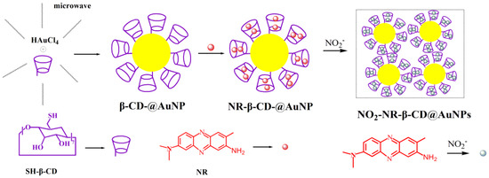 2.4. Preparation of Fluorescence Dye-Incorporated SH-β-CD Functionalized Gold Nanoparticles (NR-β-CD@AuNPs)
