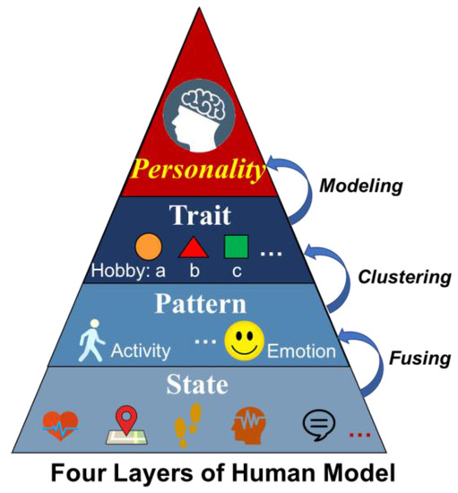 One issue for Cyber-I modeling is the accurate and comprehensive computation of an individual’s personality. Generally, the human model can be classified into four layers, as shown in Figure 2. The bottom layer of human model involves various human states, such as the physiological state, i.e., heartrate and brain activity, or the behavior state, i.e., running, walking, or talking, etc. For the second layer, the person’s pattern such as their activity pattern or emotion pattern are described. More abstractly, the third layer shows the person’s traits in different aspects, for example taking part in a hobby such as watching movies, or their working style. These three layers covers the aspects of a human from the concrete to the abstract. However, the top layer is the modeling of a human’s psychological state, namely personality. To the present day, there has been a great deal of research into personality computing based on the widely used “Big Five” personality trait theory depicting users’ features from five different aspects. Guntuku et al, create a personality model from the perspective of user favorites [31]. Vinciarelli surveyed personality computing in terms of measuring, perception and evaluation [32,33]. According to this survey, Mohammadi and Vinciarelli attempted Automatic Personality Recognition based on users’ prosodic features [34]. In this research, the research methods of personality recognition have also been adopted as one aspect of personality computing. The difference lies in perception being based on personae for the general depiction of an individual’s pattern in all aspects of daily life, instead of merely being derived from a single or limited number of certain situations.