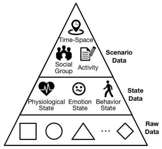 The main use of collected personal data is for further scenario construction and persona modeling. Due to the differences in the elemental composition of scenario and persona, their requirements for personal data are correspondingly different. Concretely, scenario construction needs data that indicates the basic elements of a scenario, i.e., time, location, type of activity and who is involved. Hence, such data, named scenario data, consists of the top layer of personal data. In contrast to the scenario data, the state data is for the comprehensive description of a person’s state within a concrete scenario, as shown in the center of Figure 5. Because scenario data is limited to showing the rough activity type, i.e., walking, playing, or chatting with others, such data is not rich enough to provide description of a personal state. Hence, state data contains a person’s records of all of the states and its variations in terms of physiology, emotion, and behavior. Consequently, during the same scenario, the differences in state data from person to person reflect the uniqueness of the individual. Aside from the two kinds of data above, other kinds of data are classified into the raw data, as is shown in the bottom layer of Figure 5. Raw data is data that cannot obviously indicate the scenario elements or human state. However, by further digging, such data may indicate some hidden information which contributes to the scenario data and state data. For example, the voice records on a person’s smartphone may be detected by machine-learning, and may identify a person or people in the immediate vicinity of the smartphone carrier. The process of obtaining the scenario data and state data by mining this raw data is called personal data unification. The details of personal data unification are explained in the next sub-section.