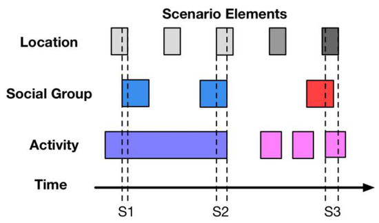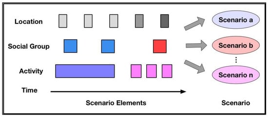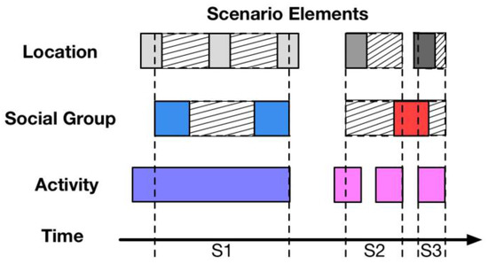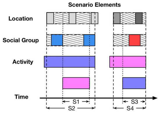 Figure 6 provides an overview of scenario normalization. The labels of scenario elements are shown on the left in Figure 6. They are location, social group, and activity. In the middle of Figure 6, each small square refers to a scenario element corresponding to its label on the left. From left to right, array of squares is arranged in time order. For a certain square array, for example, a square with a different color refers to a different activity, and the width of each square represents the duration of such activity according to the personal data. The scenario normalization function detects and generates a set of normalized scenarios from the scenario data over a period of time. The formulation of scenario elements is illustrated in the next sub-section.