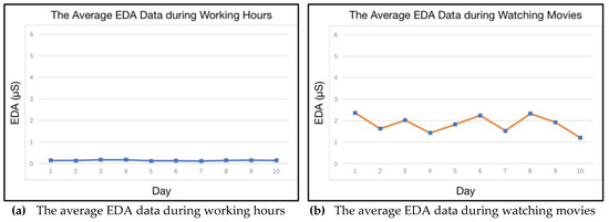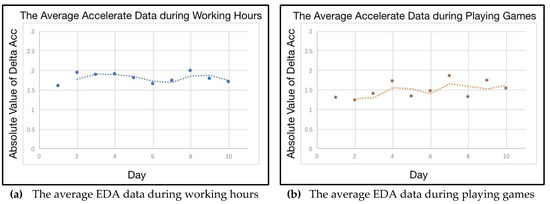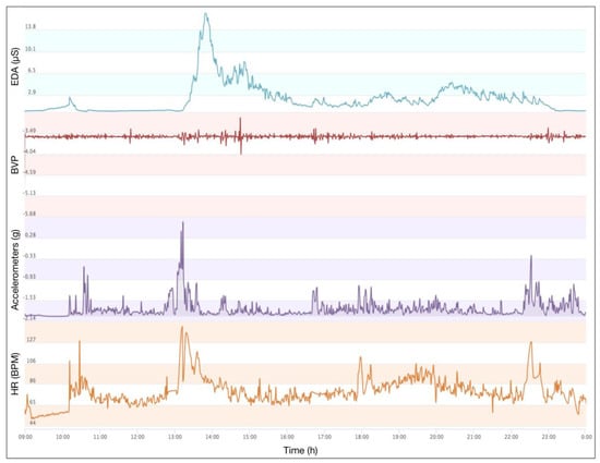 In this sub-section, the visualization of a person’s characteristic is shown, based on/without his or her persona. Three features are selected from the experiment, based on the long-term personal data of the participants. The aim of this experiment is to show the stability of a certain characteristic in a specific persona, and to demonstrate the disorder of the same characteristic ignored in the persona. The participants need to wear the Empatica E4 wristband for 10 days. An example of the sensors’ data from such wristband are shown in Figure 11. The electrodermal activity (EDA) is selected to measure the autonomic nervous system activity from the continuous variation in the electrical characteristics of the skin. EDA is highly responsive to emotions. Fear, anger, startled response, orienting response, etc., are among the reactions that may be reflected in EDA. Hence, in this research, the emotional variation of the participant can be sensed and recorded in the EDA data. Meanwhile, the delta acceleration from accelerometers is selected to indicate the behavior variation of the participants. Heart Rate data is also selected to reveal the physiological features in the course of different persona.