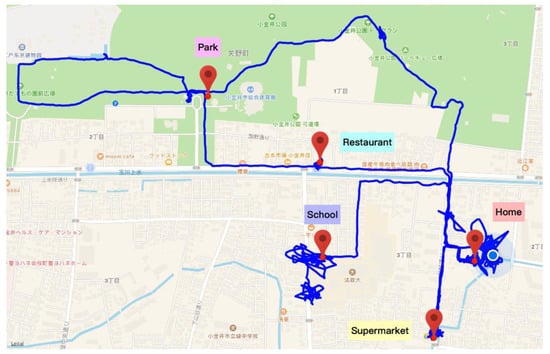 The scenario elements were collected separately according to a tester’s smartphone data, wearables data and Internet data. Specifically, the location was detected by GPS data from smartphone, as shown in Figure 15. Five regular places are home, school, a restaurant, a park and a supermarket. And the scenario data of a whole day of life are displayed in Figure 16.