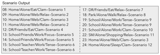 The third scenario element is the activity. In previous research, user’s activity was detected from wearable devices, a computer logger and the Internet data, such as that derived from checking email, surfing the web, chatting via WeChat, sleeping, walking, etc., and is shown in Equation (4):