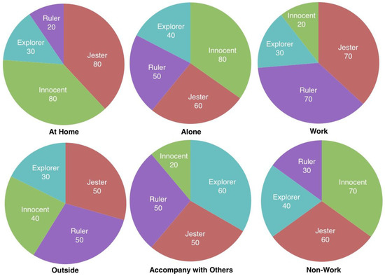 As the fundamental part for personality computing, the facet persona shows the different composites of archetypes in different situation. Due to the measurement of persona through various personal data, the facet persona in terms of three different facets are classified accordingly, and the results shown in Figure 17. As components of persona, four archetypes were characterized, namely, Jester, Innocent, Explorer, and Ruler. The four archetypes were generated in different proportion into each kind of persona in the twelve scenarios above. Three different facets were selected, referring to a tester being home or not, alone or not, or working or not. A group of facet personae are shown in Figure 18.