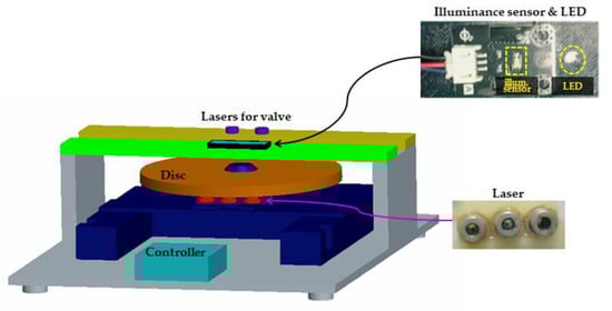 The proposed design of the LOD system is depicted in Figure 1. The design is essentially based on the concept of a CD-ROM used in a computer. The system is equipped with two laser modules. One is for valve control and the other is for conducting cell lysis. The former module serves to block the inlet and vent channels of lysis chamber by two lasers (QL80T4HD-Y, QSI, Cheonan, Korea). Meanwhile, the latter module, made of three lasers positioned to fit the chamber size, serves as a heating source for cell lysis. In order to automate this heating process during cell lysis, a laser controller for heating and maintaining temperature is placed in the lower part of the system. An illuminance sensor (TEMT6000, Vishay, Selb, Germany) is located directly above the laser module (Figure 1). All valves are also operated by laser control. The system laser modules for valve operation and the lysis heating process and the illuminance sensor are centered on the disc. An LED is attached to the side of the illuminance sensor to illuminate the upper PCM layer of the disc. The PC-based laser pulse width modulation (PWM) control is achieved by detecting the varying intensity of the heating process.