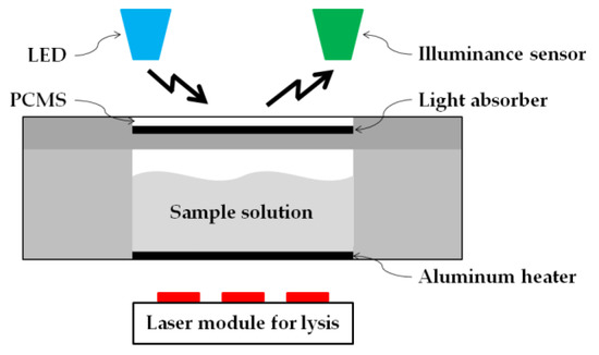 Phase change material (PCM) is a substance with a high heat of fusion which, melting and solidifying at a certain temperature, is capable of storing and releasing large amounts of energy [33]. When this PCM is transformed into a sheet form, which name “PCMS”, with a thickness of few micrometers, its status becomes very sensitive to temperature change. PCM-60 implies that its phase change occurs at a temperature of 60 °C. PCM-60 appears opaque white at room temperature, but at temperatures above 60 °C, its phase changes to that of a transparent liquid. As shown in Figure 1, the laser module for lysis heating is arranged at the bottom of the disc. Increase in temperature of the heater, made of aluminum sheet, causes the temperature in the lysis chamber to rise. PCMS is placed at a distance of 0.2 mm from the lysis chamber to facilitate maximum heat transfer from the lysis chamber to the PCMS. A light absorber is located under the PCMS. Above the PCMS, there exists an LED that is always in the ON state and an illuminance sensor (Figure 1). In the solid, opaque phase, PCMS reflects all the light of the LED and directs it to the illuminance sensor. In the liquid, transparent of PCMS, all the incident LED light is directed towards the light absorber. Since there was no light entering the illuminance sensor, the value indicated by it becomes zero.