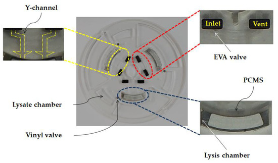 Polycarbonate was used as the main material in the fabrication of the disc in order to withstand the heat generated during the lysis heating process. Inlet and vent holes were drilled at innermost locations on the disc. The inlet and vent holes form essential parts for sample liquid injection. The EVA valve, Y-channel, lysis chamber, vinyl valve, and lysate chamber were arranged on the disc as depicted in Figure 5. The EVA valve was fabricated to prevent leakage of the injected liquid, while the Y-channel was designed to minimize leakage through the vent hole when the liquid is being injected into inlet hole. The lysis heating process was carried out in the lysis chamber thereby activating the reaction with PCMS constituting the top layer. After completion of the heating process, the vinyl valve was opened and the liquid was transferred to the lysate chamber by rotating the disc. Since a vent hole is also provided, the liquid in the lysate chamber can be taken out through use of a syringe.