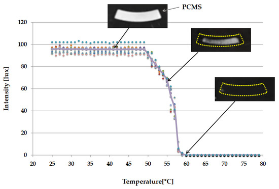 As the temperature in the lysis chamber increased, the heat generated was transferred to the PCMS causing it to gradually melt. At 60 °C, the PCMS was found to have completely liquefied with its phase changing to that of a transparent liquid. The black floor of the plate beneath the PCMS layer, which also served as a light absorber, was, thus, exposed. As a result, the amount of reflected light entering the illuminance sensor had gradually diminished.