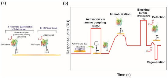 Schematic overview of the direct bioassay. (a) Schematic representation of activation via amino coupling on the CMD 200 surface. Carboxyl groups have been activated for covalently immobilising the TNF-α protein. Ab anti-TNF-α is detected once the protein has been immobilised. (I) Plasma samples from patients taking adalimumab and their controls; (II) Procedure for obtaining adalimumab spiked calibration curve in vitro. (b) A typical sensorgram obtained by SPR, showing all the stages involved in adalimumab quantification.