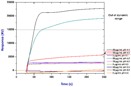 pH scouting gave values outside the equipment’s dynamic range (50 µg/mL, pH 4.1 and 4.5); it could thus be inferred that the data so obtained at this concentration exceeded the refraction index response limit for Biacore 2000 equipment (i.e., 15,000–30,000 RU, with 1.33–1.36 refraction index) [71]. Because the other 10 μg/mL concentration protein injections at pH 4.1 and 4.5 (shown on the sensorgram) came within the dynamic range (signal shown without grey shading on the sensorgram), it was decided to choose the one having the greatest SPR signal electrostatic interaction. However, refractive indices for solutions at the other two concentrations (10 μg/mL and 5 μg/mL) came within the dynamic range estimated for the equipment. According to reports in the pertinent literature, pre-concentration assays change ligand surface and charge; pH scouting is influenced by ligand concentration and the pH of the buffer used for dilution. Ligand dilution buffer values are usually lower than those for its isoelectric point (pI) (0.5 pH units). High pre-concentration values do not guarantee that a ligand will bind in large quantities [64].