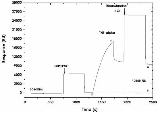 Figure 3 shows the result of immobilising ligand on the CMD 200 sensor surface. The response for immobilising human TNF-α recombinant protein was 10,449 RU. This value was 10.44 ng/mm2 surface concentration, based on the equivalence of changing the signal in SPR of 1000 units being equivalent to increasing immobilising matrix mass by about 1 ng/mm2 [67].