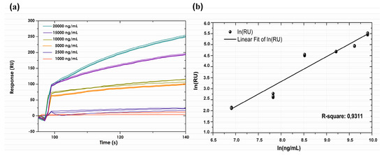 (a) Association and dissociation curves for the different adalimumab spiked concentrations in vitro. (b) Standard curve for resonance units (RU) compared to anti-human TNF-α. The concentration values used for the standard curve were 1.0, 2.5, 5.0, 10.0, 15.0 and 20.0 µg/mL. R-squared was 0.9311.