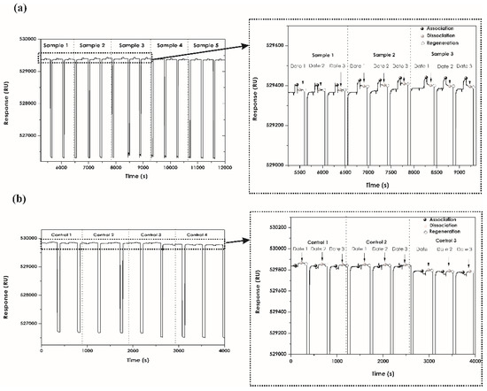 Regeneration assays must be carried out with suitable chemical solutions to ensure total availability of ligand binding to analyte and good analyte removal. Regeneration was studied using the equation reported in the pertinent literature [58,61,64], ensuring higher than 90% for individual sample injections. Glycine HCl solutions at low pH function very well and are used as agents for optimising regeneration. This may possibly be due to proteins being positively charged at these pHs. Protein binding sites repel each other and this causes molecule remoteness [64]. Other agents such as surfactant solutions (i.e., SDS) enable good removal of analytes and plasma samples. Monitoring base line stability is fundamental for ensuring ligand activity and total removal of remaining bound proteins. The good plasma sample binding assay reproducibility and regeneration percentages ensured specific binding and that the matrix was not damaged.