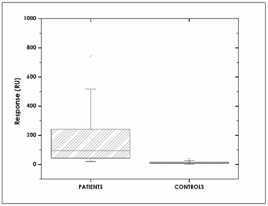 Resonance units (RU) obtained for samples from patients and healthy volunteers; the results were significantly different (p < 0.005).