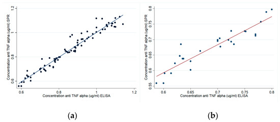Figure 7a,b shows a 0.97 R2 correlation for patients and 0.91 for healthy volunteers regarding response values obtained by SPR and traditional ELISA methodology. Such results suggested that SPR had similar sensitivity to a commercial ELISA kit in quantifying anti-TNF-α in plasma samples.