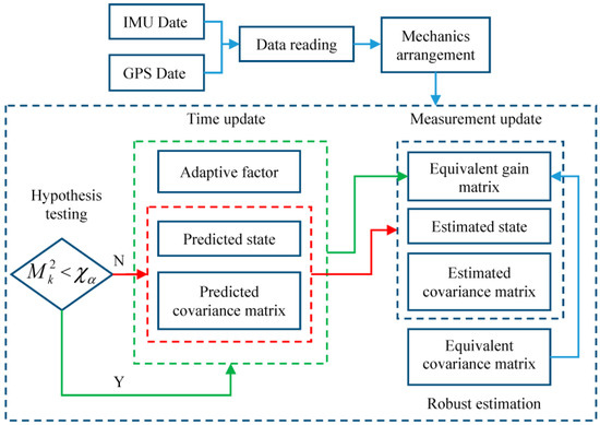It is concluded that both the adaptive factor and the scaling factor are constructed through the predicted residual . Influences of outlying measurements on the filtering results can be controlled by the robust estimation, however, the influences on the adaptive factor cannot be controlled, and this may cause noticeable effects on the filtering results. Consequently, the improved adaptively-robust filtering strategy is constructed. In the improved adaptively-robust filtering strategy, the hypothesis test is performed, first, at all epochs, and the testing results determine the following strategy. Only the robust estimation method is performed if test statistic is smaller than , otherwise, the robust estimation method is applied together with the adaptive factor. Namely, the adaptive filter is performed only at the epochs wherein the tested measurements do not contain outliers. Figure 1 displays the process of the proposed filtering strategy.