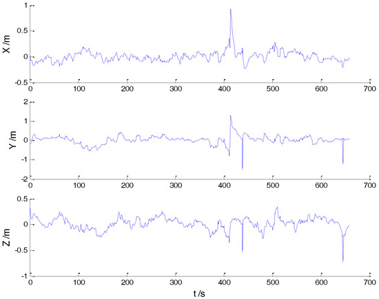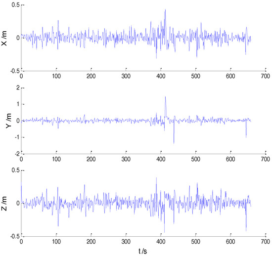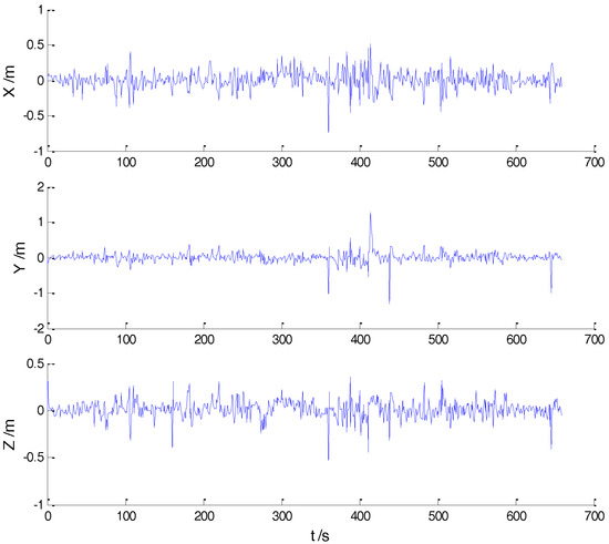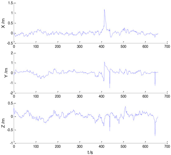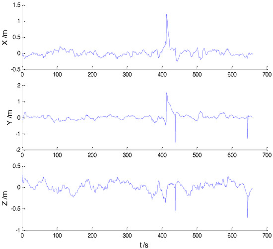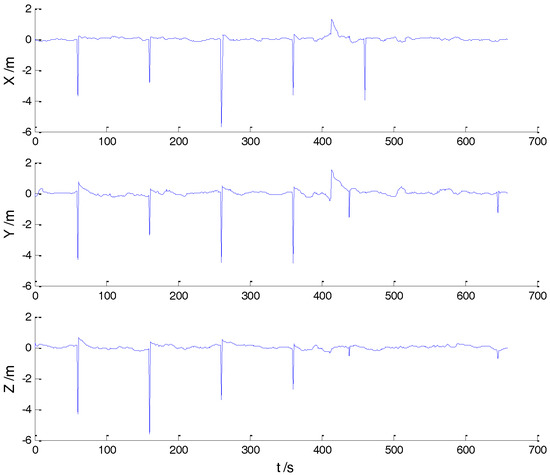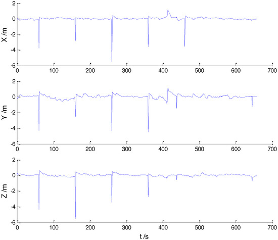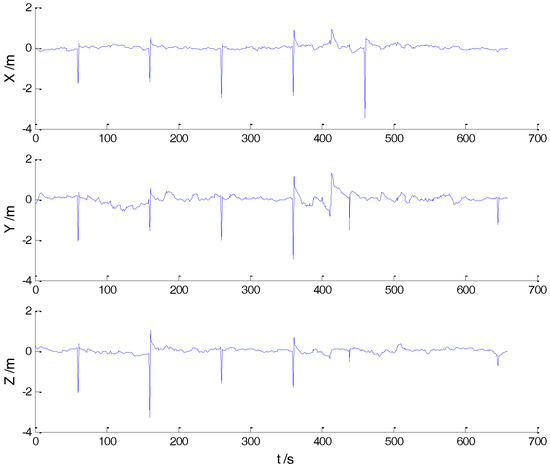 In order to test the robustness of the improved adaptively-robust strategy, the scattered outliers were added artificially to the initial measurements, thus, the data with outliers were constructed. Then, the aforementioned four schemes were performed with the data contained by the outlying measurements. The position errors of all schemes are displayed in Figure 6, Figure 7, Figure 8 and Figure 9: