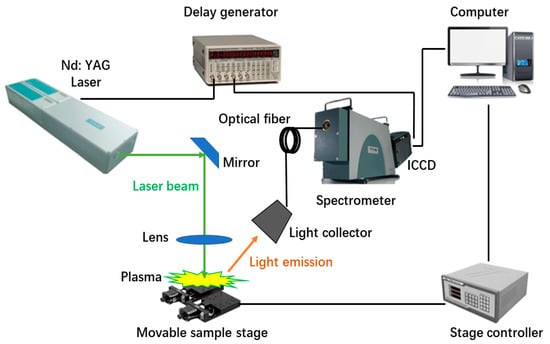The experimental setup mainly consists of a pulsed laser (Vlite 200, Beamtech, Beijing, China), a delay generator (DG645, Stanford Research Systems, Sunnyvale, CA, USA), optics, a movable sample stage (TSA50-C, Zolix, Beijing, China) with controller (SC300, Zolix, Beijing, China), a spectrograph (ME5000, Andor, Belfast, UK), an ICCD camera (DH334-18F-03, Andor, Belfast, UK), and a computer. Figure 1 shows the structure of the LIBS system used in the experiment. A high-power laser pulse is focused on the surface of the sample through a set of optics. The interaction of a laser beam with matter is complex and not fully understood yet, but it will lead to the formation of a plasma with a high temperature above the sample surface. This evaporated plasma contains many excited species whose light emissions are later collected and analyzed [9].