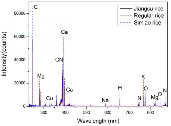 LIBS is a form of element analytical spectroscopy, reflecting the emissions of excited atoms and ions from a produced plasma [19]. The average spectra of three kinds of rice samples are illustrated in Figure 2, showing the similarity of elemental composition in rice. According to the NIST database, the main spectral emission lines corresponded to C (247.856 nm), Mg (279.553 nm, 285.213 nm, and 821.304 nm), Cu (324.754 nm and 327.396 nm), CN (388.246 nm), Ca (393.366 nm and 422.673 nm), Na (589.592 nm), H (656.277 nm), N (742.364 nm, 744.229 nm, 746.831 nm and 868.340 nm), K (766.490 nm and 769.896 nm), and O (777.194 nm and 844.636 nm). In this case, a chemometric data analysis method was needed for further detailed analysis. Samples, without adding extra Cu, were used to distinguish the differences among three kinds of rice, i.e., 10 samples for each kind and 30 samples in total.