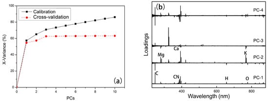 The LIBS full spectra were analyzed by PCA. The total number of rows (30) and columns (22,036) corresponded to the number of samples and the spectral wavelength, respectively. The maximum number of PCs was set as 10 when calculating. The loadings (see Figure 3b) showed the main distinguishing elements of the spectra, e.g., C at 247.856 nm, Mg at 279.553 nm and 285.213 nm, K at 766.490 nm, and Ca at 393.366 nm and 422.673 nm.