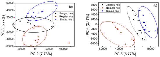 Scatter plots of PCA scores. (a) Scores plot of PC2 vs. PC3; and (b) scores plot of PC3 vs. PC4.