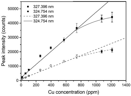 Figure 5 shows the relationship between concentrations of Simiao rice and their corresponding peak intensities at 324.754 nm and 327.369 nm. According to the curve-fitting results, self-absorption phenomenon was evident when the reference Cu concentration was larger than 1000 ppm. However, no feasible self-absorption could be found at the corresponding spectral lines. According to the previous study, a pronounced non-linearity in the calibration function at increasing concentration (greater than approximately 1000 ppm), with or without a feasible occurrence of self-absorption on the spectra, was caused by the complex interaction mechanism between the atoms/ions and the radiation which is emitted and successively reabsorbed [49]. In this experiment, we would simply focus on the data where Cu concentrations are smaller than 1000 ppm.