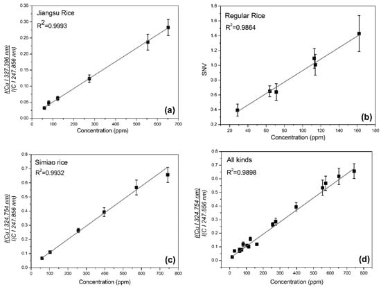 The calculated coefficients of variation of peak intensities for each kind of rice varied from 4– 25% (n = 10), which might affect the performance of linear regression. According to the previous study [51], the intensity of the signal correlated with the amount of the ablated matter to some degree. The fluctuation of pulse energy is one of the reasons that cause this problem [52], and the RSD for shot-to-shot variation could reach up to 60% in LIBS [16]. During the experiment, we also found that the ablated craters became larger with higher metal element concentrations, which would absolutely make an impact on the signal intensities and subsequent linear regressions. Additionally, the diversities of different kinds of rice (which we discussed in Section 3.1) might contribute to the fluctuations of intensity, as well. The most common methods to reduce fluctuations for quantitative analysis were the “internal standard” method and the “background normalization” [53].
