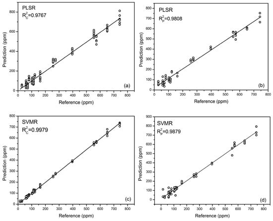 Calibration and prediction for multivariate analysis. (a) The calibration result of PLSR; (b) the prediction result of PLSR; (c) the calibration result of SVMR; and (d) the prediction result of SVMR.
